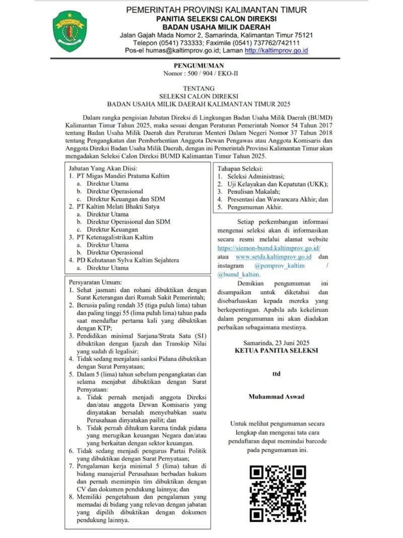 Lensakata.co, SAMARINDA – Pemerintah Provinsi Kalimantan Timur (Pemprov Kaltim) resmi membuka pendaftaran seleksi calon direksi untuk sejumlah Badan Usaha Milik Daerah (BUMD) tahun 2025. Pengumuman tersebut disampaikan melalui surat bernomor 500/904/EKO-II yang dikeluarkan oleh Panitia Seleksi (Pansel).